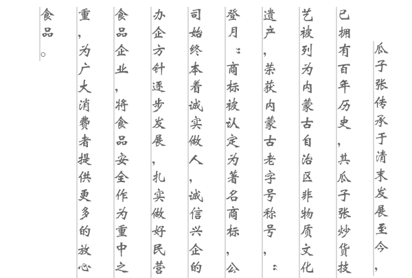 內(nèi)蒙古瓜子張食品有限責任公司是一家以經(jīng)營堅果炒貨、食用油加工的生產(chǎn)型食品企業(yè),公司于2010年2月注冊為有限責任公司,坐落在有著8000年紅山文化發(fā)源地——赤峰,占地面積13333㎡、建筑面積8000㎡。